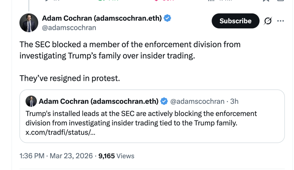 Insiders profited from his lies in broad daylight! pic.twitter.com/RhE3hiC0lj— Adam Cochran (adamscochran.eth) (@adamscochran) March 23, 2026