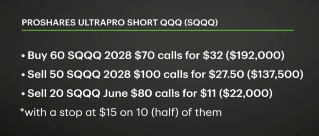 Now the focus shifts to protecting those gains. The hedge uses the ProShares UltraPro Short QQQ ETF (SQQQ), a three-times inverse ETF on the Nasdaq. In simple terms, if the Nasdaq falls 1%, SQQQ is designed to rise about 3%, though there are nuances like decay over time. The structure of the trade involves buying 60 long-dated 2028 $70 calls, selling 50 of the 2028 $100 calls, and also selling 20 short-term June $80 calls for income. This brings the net cost of the position to about $32,500, while the total spread has a potential value of $180,000.