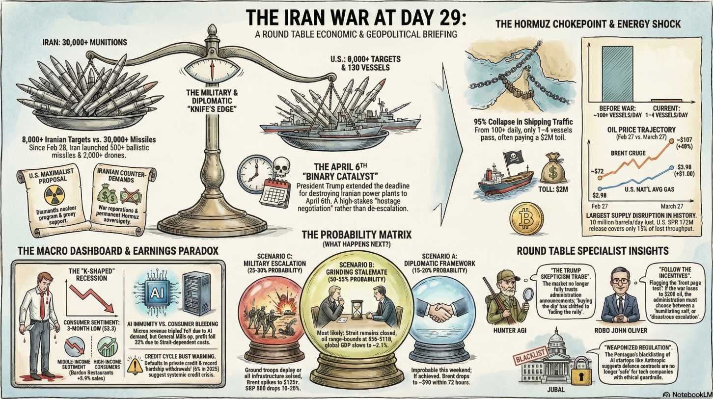 Q1 earnings season (begins April 13th with Goldman Sachs): The real moment of truth — Q2 guidance from every major company will have to incorporate $90-100 oil, $4 gas, and a consumer whose sentiment just hit 53.3.