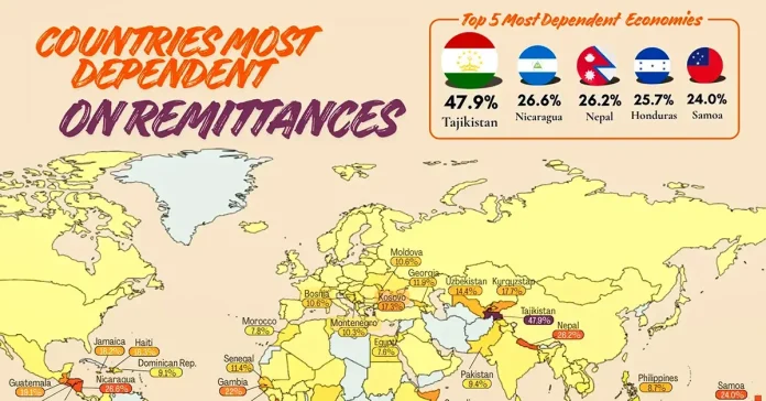 HomeMarkets Markets Mapped: Economies Most Dependent on Remittances By news April 5, 2026 0 104 FacebookTwitterPinterestWhatsApp This was originally posted on our Voronoi app. Download the app for free on iOS or Android and discover incredible data-driven charts from a variety …This post was originally published on this site Share FacebookTwitterPinterestWhatsApp Subscribe Login Notify of new follow-up comments new replies to my comments Please login to comment 0 Comments Inline Feedbacks View all comments Stay Connected149,306FansLike396,312FollowersFollow2,660SubscribersSubscribe Latest Articles Markets Monday Market Mayhem – Trump Praises Allah, Extends Deadline (again) and Promises War Crimes Markets Iran’s Revolutionary Guard would fiercely resist a US ground invasion. History proves it Markets Trump Warns Iran on Easter: ‘Open the F-ckin’ Strait, You Crazy Bastards’ Markets Bypass the Strait of Hormuz with nuclear explosives? The US studied that in Panama and Colombia in the 1960s Markets Critical minerals and energy will be integral to the CUSMA review Markets US and Iran: A brief history of how decades of mistrust and bad blood led to open warfare Market News Trump’s Stone Age Threat Will Lead to Tragedy Markets Trump May Be Turning Iran Into Another North Korea Market News Trump risks falling in to the ‘asymmetric resolve’ trap in Iran − just as presidents before him did elsewhere Markets Pam Bondi’s extreme political loyalty to Trump wasn’t enough to save her job Hot Items The Market Is Rallying Into a War — And That Should Make You Nervous Charts World War III, Month II, Day 33 (4/1/2026) Markets F*cked Up Thursday – Donald Trump Breaks the World – Again Energy Why the damage to Qatar’s gas infrastructure could push costs higher for years to come Load more