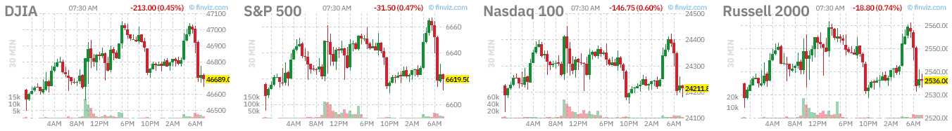 Phil noted last week that the S&P went from 4,700 to 3,600 — down 23% — as gas hit $5 in 2022. We’re at 6,450 with $4 gas after 40 days. This morning we’re opening red, with Kharg oil infrastructure hit, Ras Tanura potentially struck, the Islamabad Accord in tatters, and oil at $115.