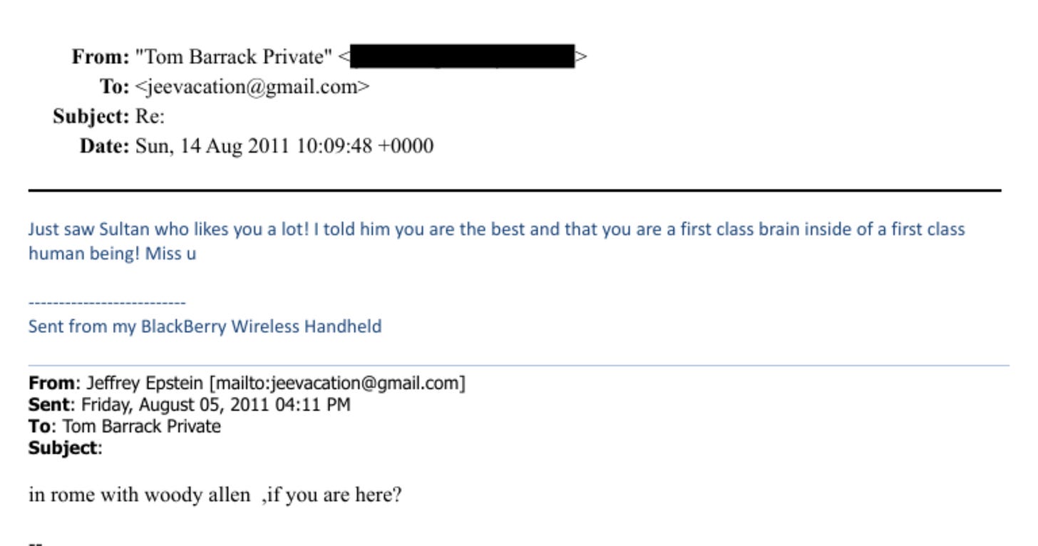 Wait—this Tom Barrack? The one writing billets-doux to Jeffrey Epstein?