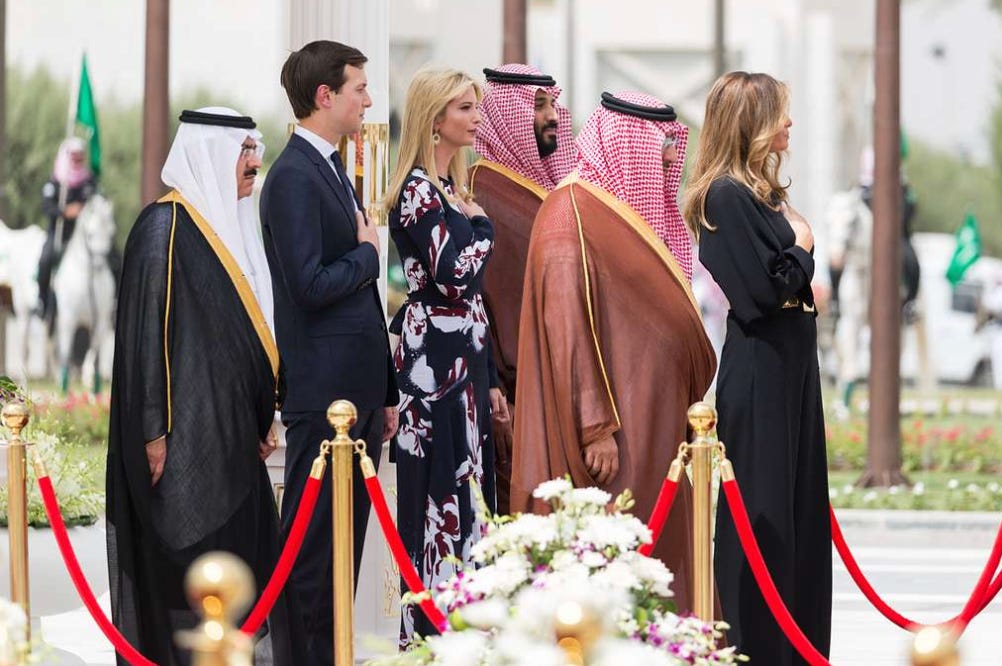 Kushner is BFFs with Mohammed bin Salman, the Crown Prince of Saudi Arabia, a psychopath who ordered—and may even have watched via close-circuit TV—the brutal execution of journalist Jamal Khashoggi (which plot Kushner probably knew about in advance). For the first few years of the Trump presidency, Kushner was the de facto ambassador to the Kingdom. He was instrumental in making Saudi Arabia the first foreign nation President Trump visited. (I wrote about this at length in 2018.)