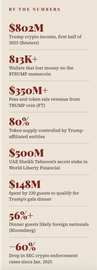 A Reuters investigation estimated that Trump-linked ventures generated approximately $800 million in crypto-related income in the first half of 2025 alone — significantly exceeding revenue from traditional Trump businesses like golf, licensing, and real estate. The World Liberty Financial token sales were reported to be the largest contributor.