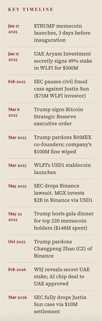 What followed over the next 15 months was a series of events — pardons, regulatory reversals, secret deals, foreign investments, and presidential decrees — that ethics experts, lawmakers from both parties, and financial investigators have described as without precedent in modern American history. The Trump administration has consistently denied any wrongdoing, dismissing conflict-of-interest concerns as politically motivated attacks.