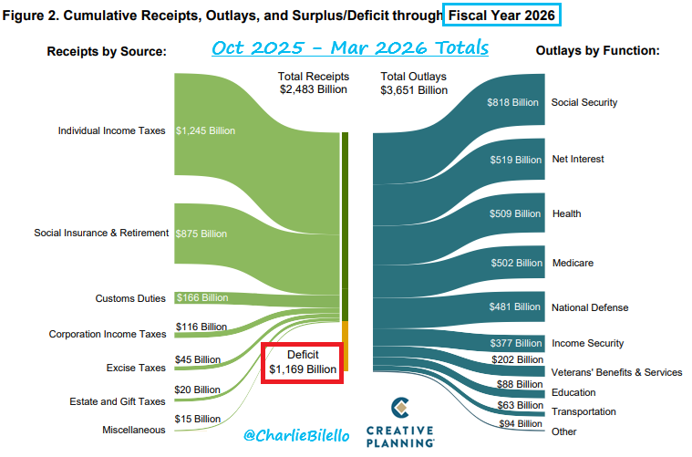 In the first half of fiscal 2026 the Government spent $3.65 TRILLION ($519 BILLION on Interest alone!) and we collected $2.5Tn for a $1.15Tn shortfall which just so happens to be 100% more than we collect in Income Taxes. The US Military has already asked for $500 BILLION more for the 2nd half of 2026 (to fight the war that is supposedly ending) so the only way we could POSSIBLY close that gap would be to DOUBLE the tax rate or 10x the Corporate tax rate and, since neither of those things will happen – just accept the fact that we are completely F’d and enjoy the ride!