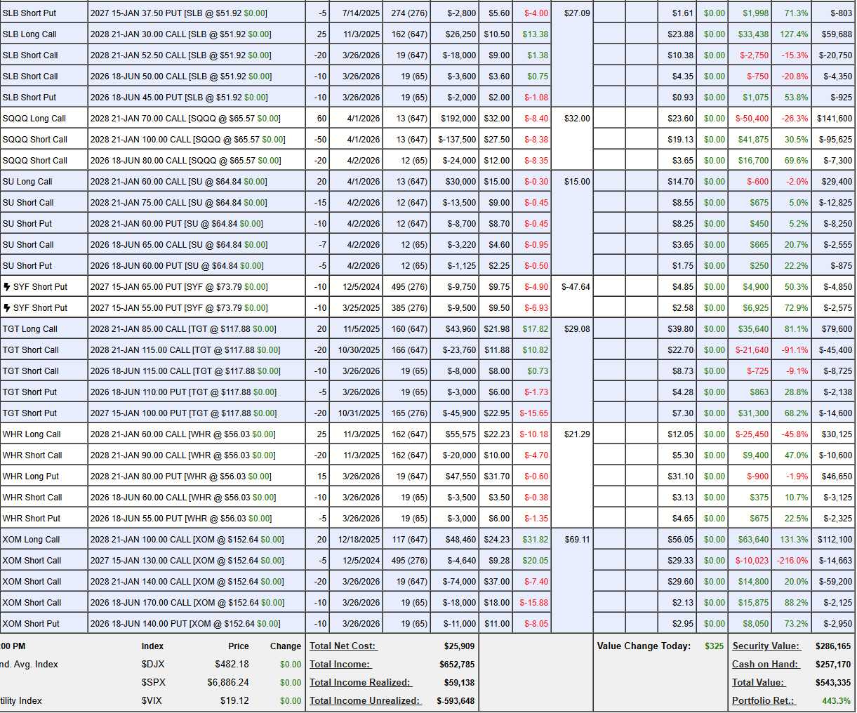 Well, that’s not true – I could have called and gotten a segment earlier to call a special adjustment but, as you know, I felt these positions were good enough to survive the worst – so we let them ride out the 10% drop. That turned out to be a blessing as we got very aggressively bullish in our March adjustments and now the MTP is at $543,335 (up 443%) with $257,170 (47%) in CASH!!! (have I mentioned how much I love CASH!!! lately?) – and that is off our $100,000 start on Aug 21st, 2024 so our 2nd anniversary is coming up (this is our 4th Money Talk Portfolio).