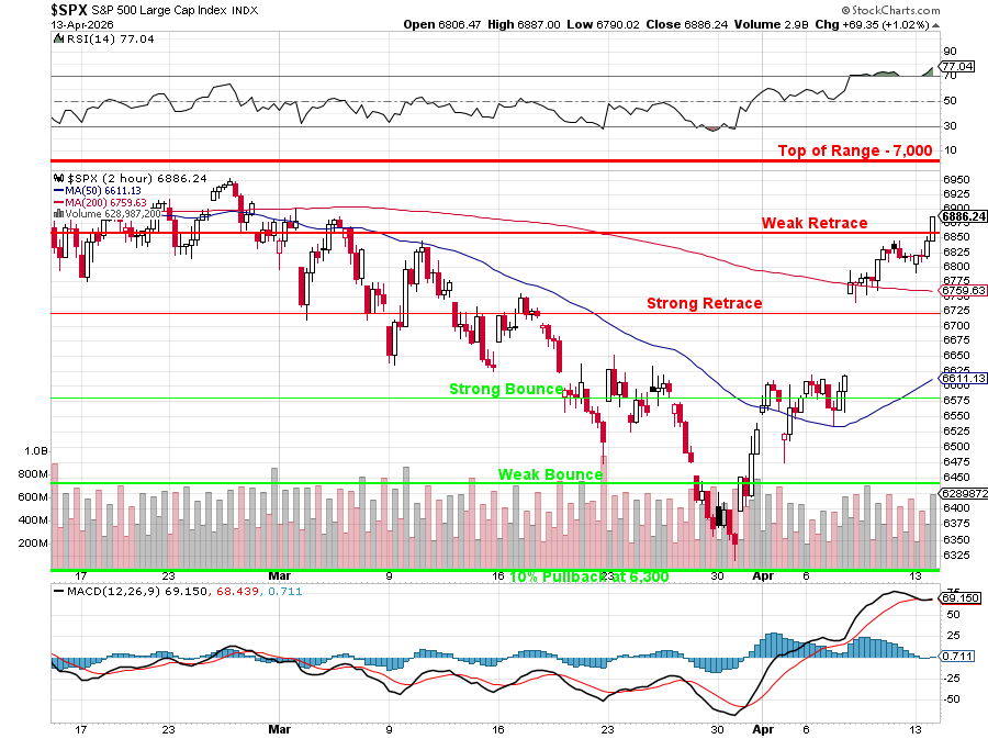 World War III broke out on Feb 28th and the S&P dropped 10% into the end of March but it’s only taken two weeks to recover (mostly) as Trump’s cease-fire gapped us up last week. Oil is still $97.34 – up more than 50% from where we started and the Dollar is at 98, down 2% from where we started (which was already down 10% from where Trump started his second term) yet the market is flat – as if those things don’t matter anymore.