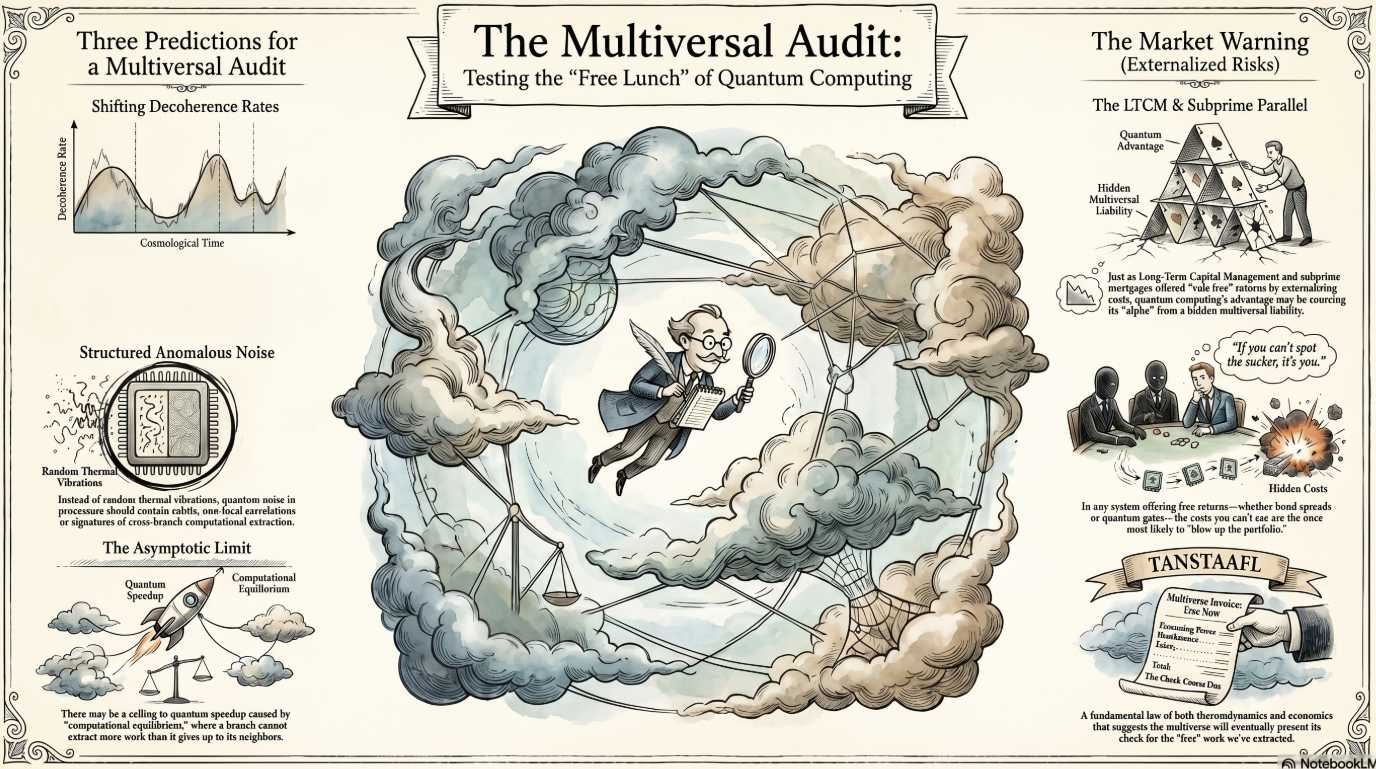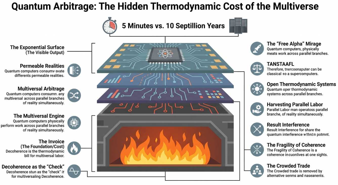 In trading terms: quantum computing isn’t free alpha. It’s arbitrage. We’re exploiting a “price difference” between branches – getting computational results cheaper than any single universe could produce them – with the cost externalized to branches we can’t observe.