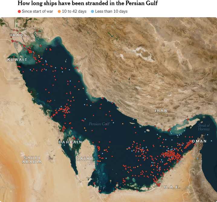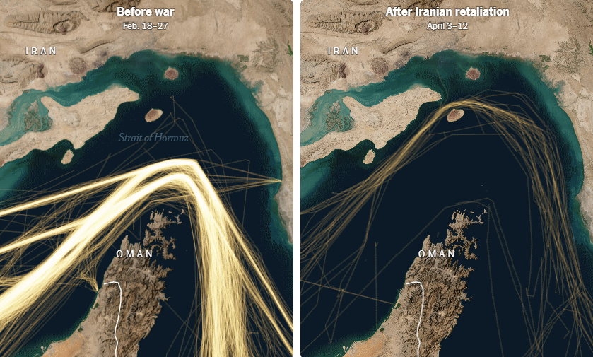 There WAS Iranian traffic bringing oil from the Strait of Hormuz and now there is NO traffic AT ALL. There are, in fact, about 900 ships trapped on the left side of the Strait and thousands of others at sea – who left weeks ago – expecting to enter the Strait to pick up oil and other commodities from Iran, Iraq, Kuwait, Saudi Arabia, Bahrain, Qatar and the UAE – all the “West of Hormuz” countries in the Gulf: