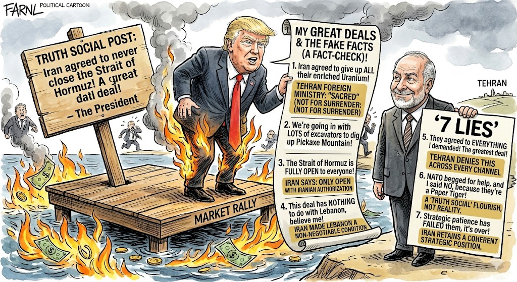 Friday’s market rally was substantially built on a single Truth Social post in which the President declared “Iran has agreed to never close the Strait of Hormuz again. It will no longer be used as a weapon against the World!” — a claim so absolute it would be charming if it weren’t lighting $200B of market cap on fire in both directions (Eurasia Review / Kampmark).