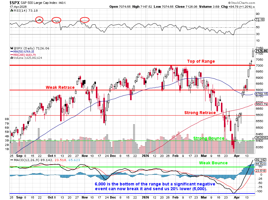 Friday, April 17: Iran’s FM Araghchi announces Hormuz “completely open” — Brent drops from $98 to $86 in 90 minutes, SPX closes +1.2% at 7,041 (BBC, NYT). Two Iranian gunboats fire on a tanker in the Strait the same afternoon (NYT).