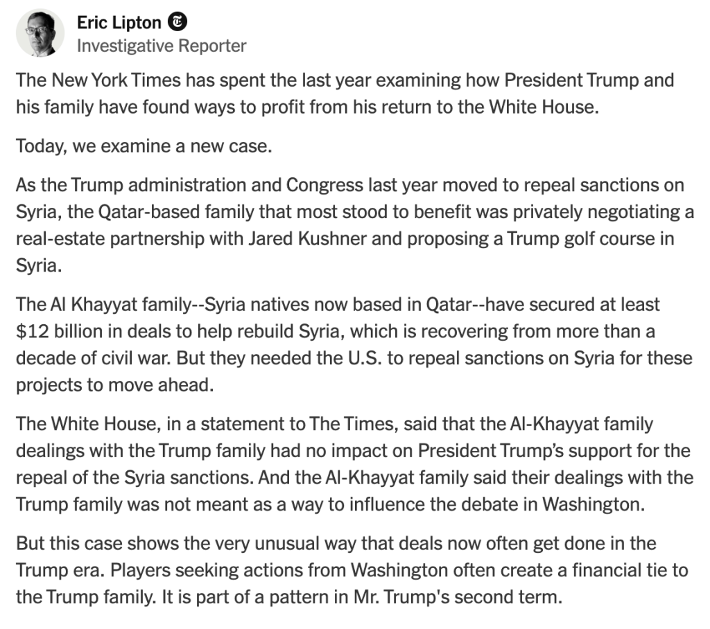 Eric Lipton’s New York Times investigation [shared: Syrian Billionaires Needed a Favor in Washington. They Invoked the Trump Name], details how a group of Syrian investors seeking to rebuild the country secured billions in contracts while simultaneously pursuing business ties with the Trump family, including a proposed Trump-branded resort. As these relationships developed, the U.S. moved to permanently lift sanctions on Syria—an outcome critical to unlocking foreign investment. While the White House denies any connection between the business dealings and policy decisions, the episode reveals a deeper problem: a system in which financial relationships tied to the president’s orbit overlap with geopolitical decision-making, blurring the line between public policy and private gain.